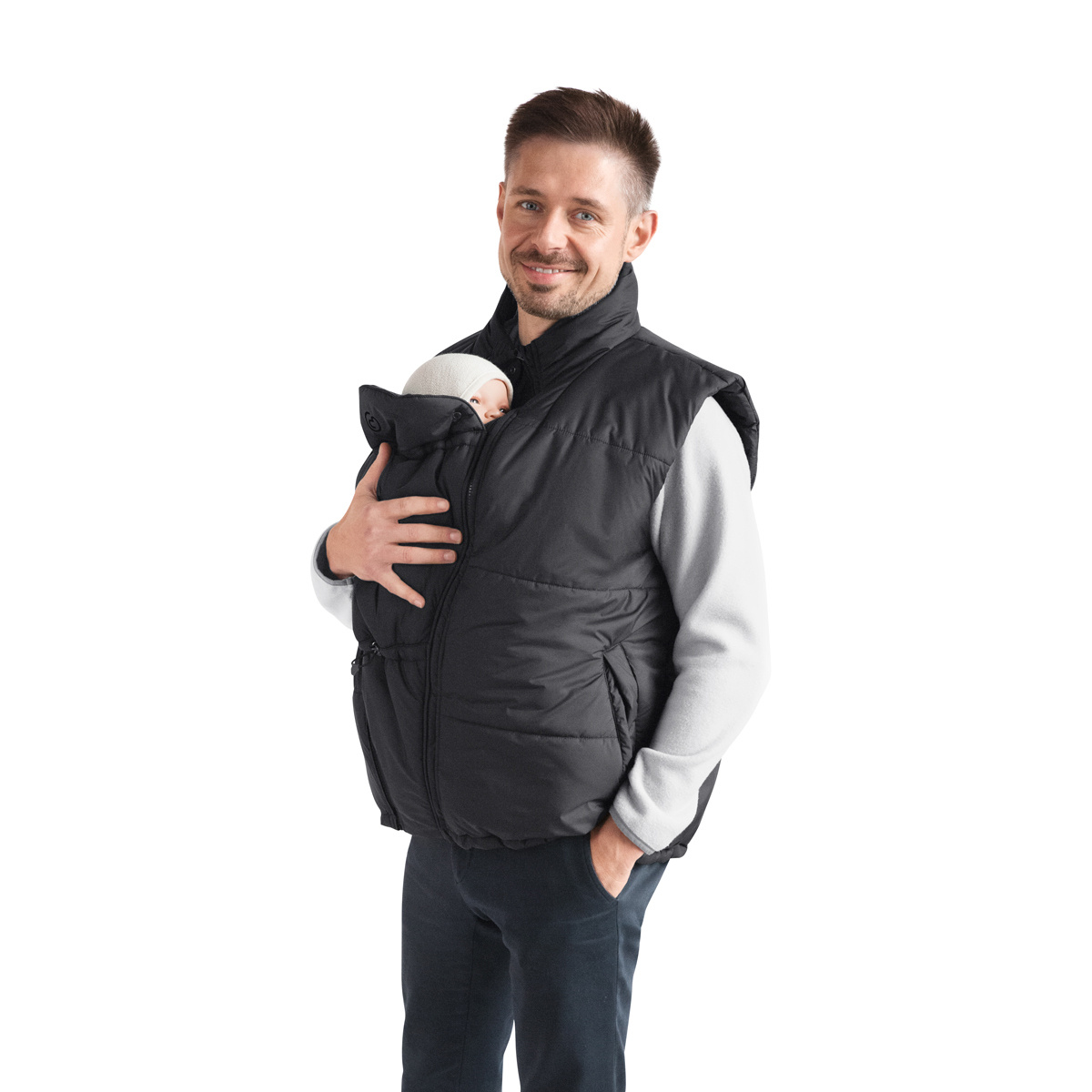 The insert adapts to both babywearing and pregnancy. You can adjust it to fit your baby’s size from birth up to approx. 24 months—and use the same insert for your baby bump, if needed. Use the elastic at your baby’s neck to keep the cold from coming in, while the fold-up neck guard shields your baby from wind and overstimulation, or folds down when it’s time to explore. The insert itself can be closed in front of your chest for a snug fit and zero drafts—no matter who’s wearing it.
