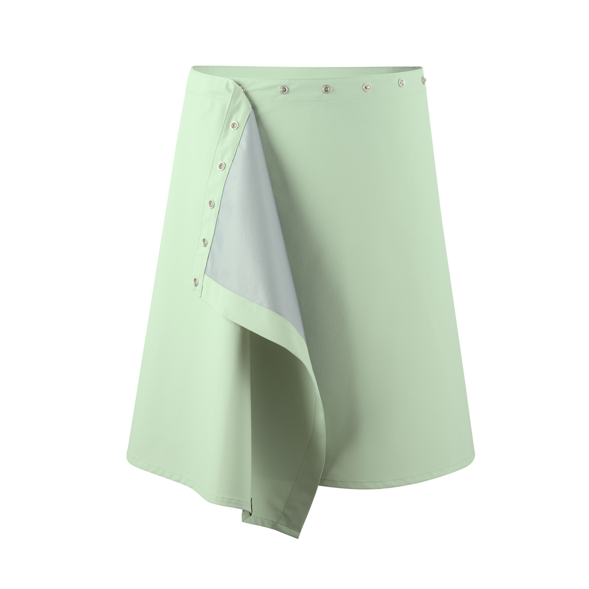 Der Regenrock ist als Wickelrock konzipiert und kann durch eine Druckknopfleiste flexibel in der Weite eingestellt werden. So kannst du ihn entweder über eine Hose tragen, alleine als Rock, aber auch in der Schwangerschaft.