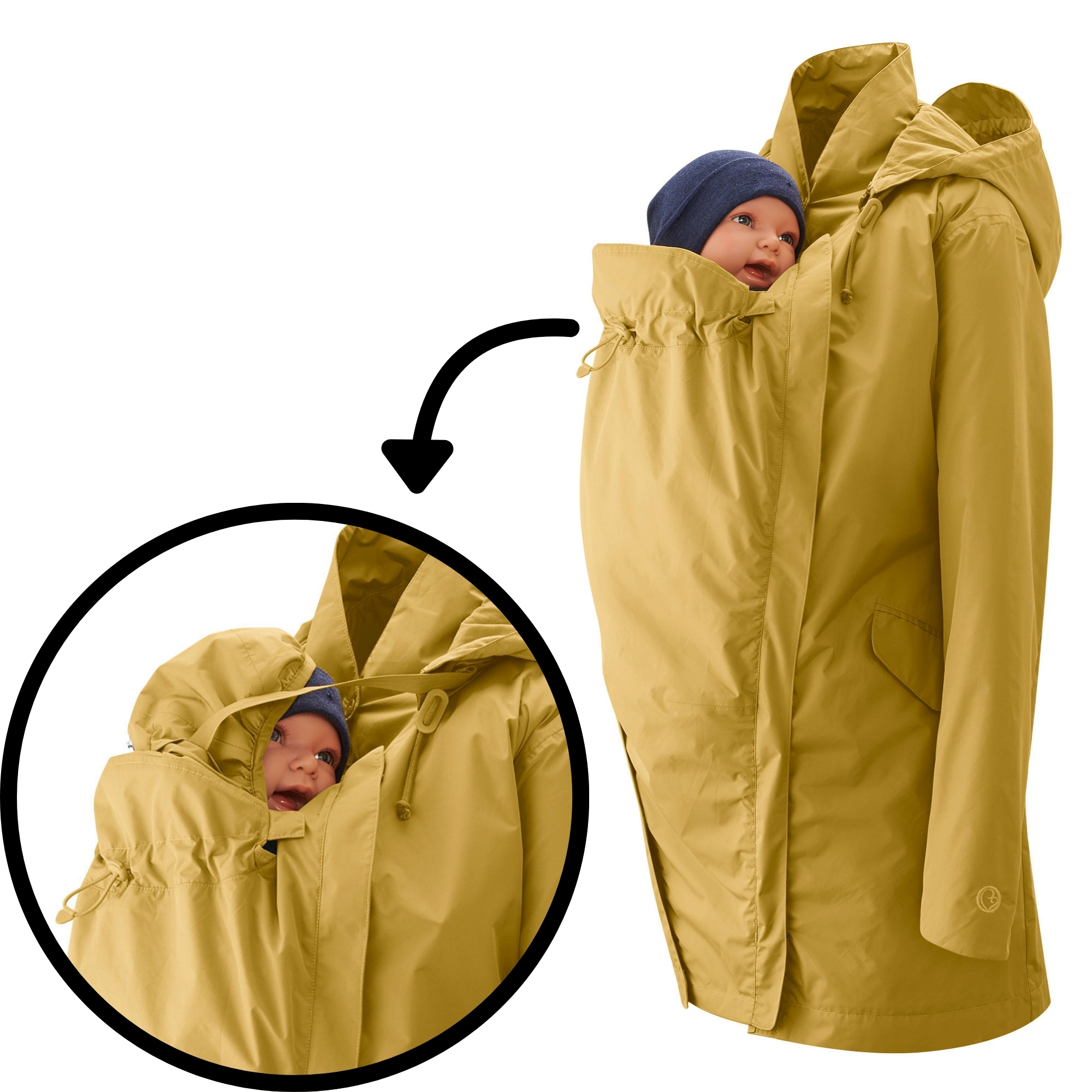 Tiefe Taschen, verstellbare ärmelweite, abnehmbare Kapuze und perfekt passende Schwangerschafts- und Traglingseinsätze für vorne und hinten.