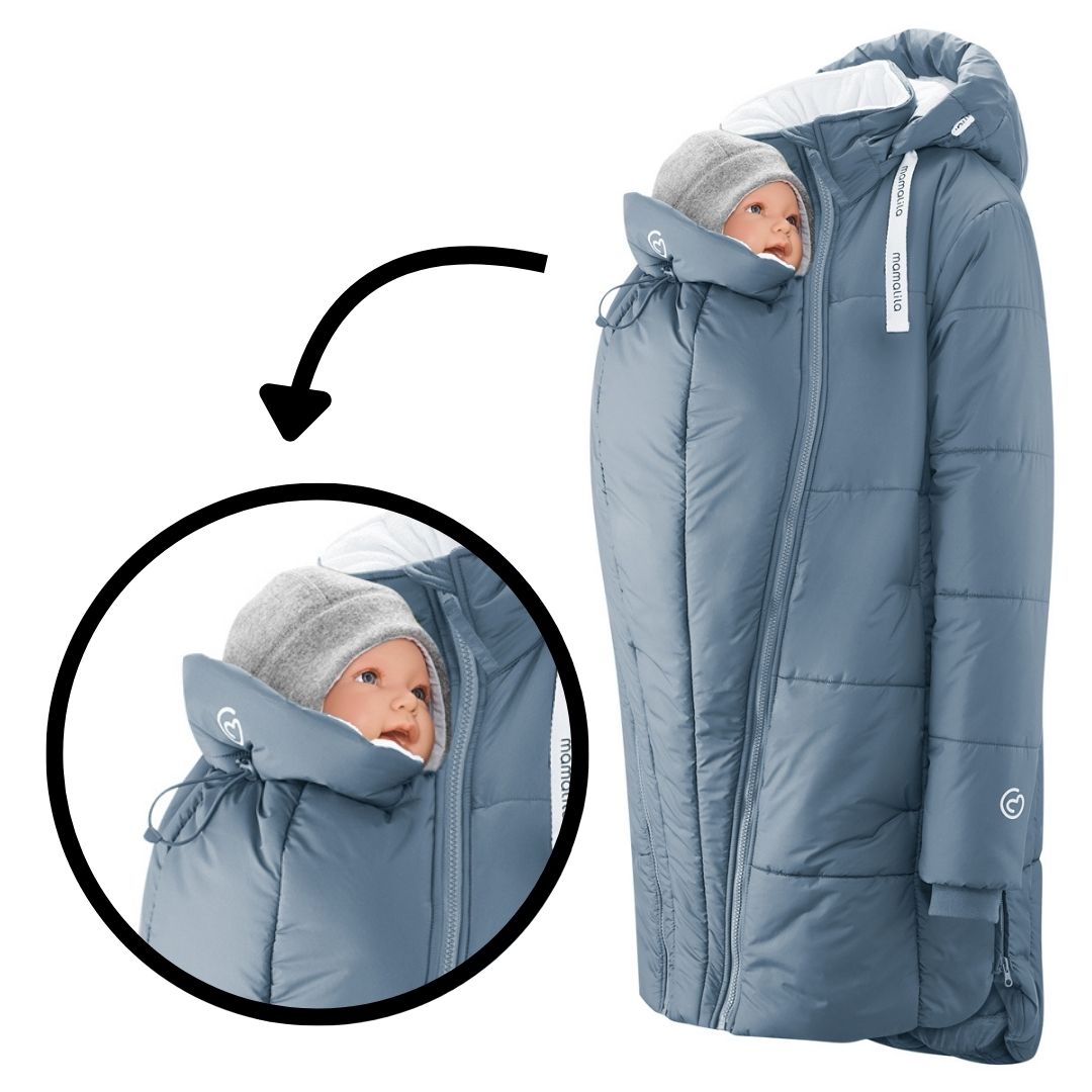 Der Babyeinsatz passt sich flexibel an die Größe deines Babys und eure Trageweise an. Mit dem Kordelzug im Nacken deines Babys schützt du es zuverlässig vor Zugluft. Die Nackenstütze kann hochgeklappt werden – z. B. wenn dein Baby schläft oder etwas Ruhe braucht – oder heruntergeklappt, wenn es wach ist und die Welt auf Augenhöhe mit dir entdecken will. Beim Rückentragen lässt sich die Kapuze einfach abnehmen – so bleibt der Blick frei und die Luftwege offen. Die verlängerte Form hält dabei nicht nur dich, sondern auch die Füße deines Babys schön warm.